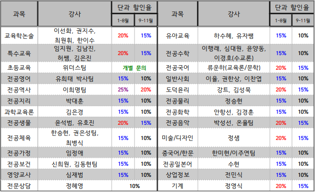 - 연간 패키지는 신청일 기준 할인율에 약 5% 추가할인 (일반사회, 전문상담 제외 / 권은성 체육 3%)